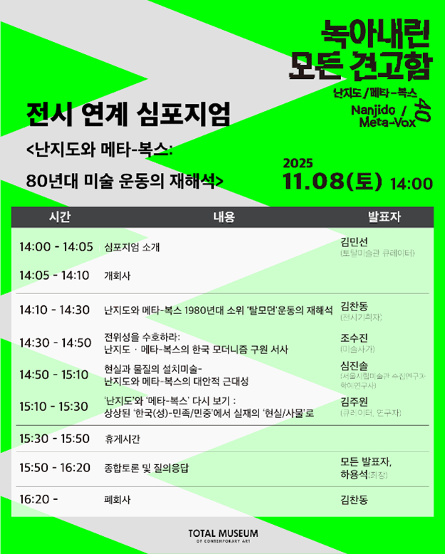 김찬동은 1980년대 중반, 대학원 재학 중 실험미술 그룹 ‘메타 복스(Meta-Vox)’*의 창립 멤버로서, 당시 미술계에 팽배하던 모더니즘 미학과 공모전 중심의 제도화된 구조에 문제를 제기하고, 대안적 예술 실천과 담론 형성을 지향하는 활동을 펼쳐왔다. 오상길, 홍승일, 하민수 등과 함께 메타-복스의 기획위원으로 참여하며 연립전 등 다양한 전시를 통해 ‘탈모던’ 미술운동의 중심에서 저항적이고 실험적인 작업을 선보였고, 오브제와 구조주의적 구성, 언어의 확장 등을 통해 표현의 경계를 넓히는 데 주력했다. 이후 김찬동은 아르코미술관장, 경기문화재단 뮤지엄본부장, 수원시립아이파크미술관 관장 등을 역임하며 문화예술 행정가로서도 활동 폭을 넓혔으며, 최근에는 나주시문화재단 대표이사로서 지역문화 정체성 강화와 현대적 문화콘텐츠 개발에 힘쓰고 있다.