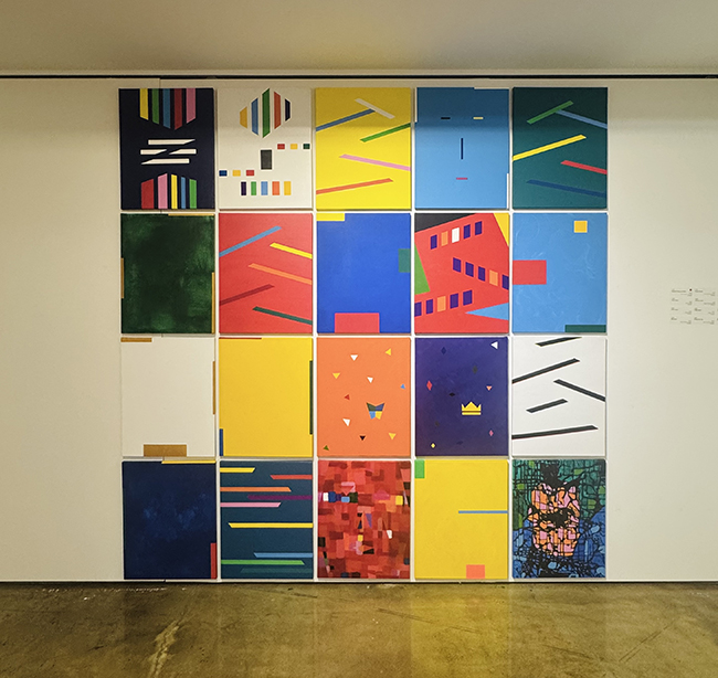 김창훈은 112점의 회화 작품을 통해 미니멀리즘과 색면 추상, 그리고 음악적 리듬을 담은 독창적인 세계를 선보입니다. 음악과 회화라는 두 영역을 넘나드는, “보이지 않는 것을 보이게 하려는” 통감각적 여정이며, 덜어내고 비워냄으로써 관람자에게 자유를 건넵니다. 단순화된 색면과 기하학적 도형들을 통해 옮겨진 음악적 리듬과 감각은 마치 베이스기타의 울림, 징소리의 격렬함이 들리는 듯 합니다. 김창훈은 “노래와 그림과 글쓰기는 나의 생업이다. 생존을 위해서라도 나는 붓을 들 수밖에 없다.” 라고 얘기합니다.