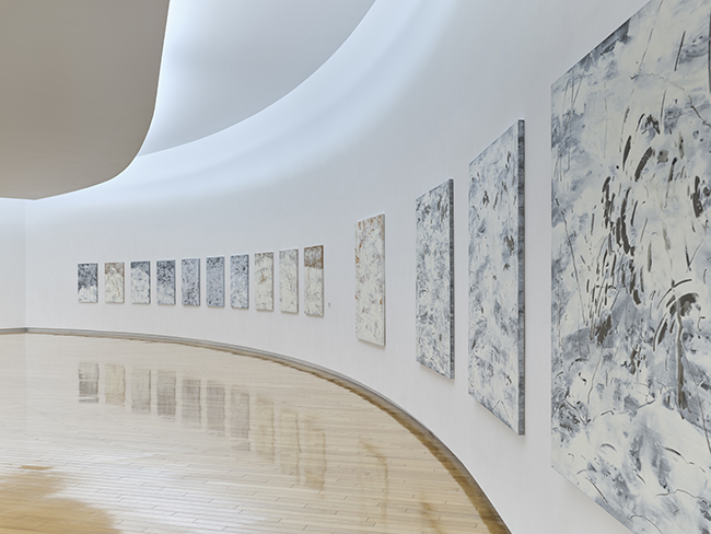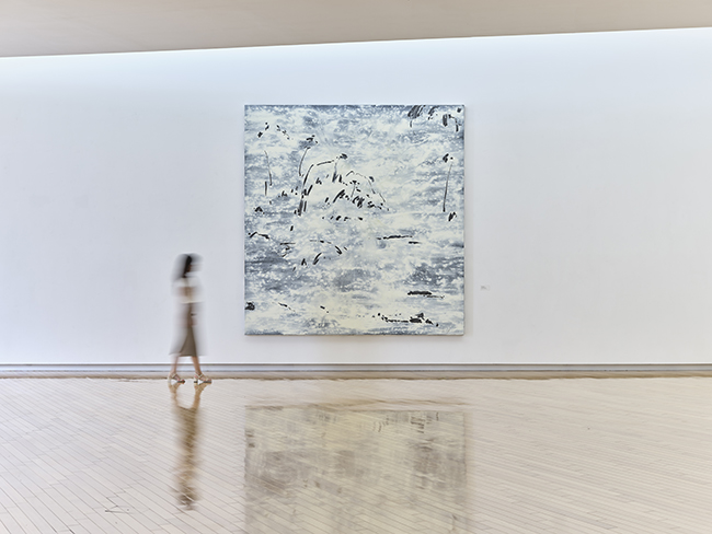 차규선의 <분청회화>는 캔버스에 흙을 바르고 그 위에 흰색 물감을 덮은 뒤, 채 마르기 전에 긁어내어 분청사기를 회화적으로 변용∙확장한 화법이다. 작가는 흰색 물감의 면이 마르기 전, 화면의 전체 구성을 미리 떠올린 뒤 한 번에 그려 내며, 작업이 시작되면 중도에 멈추지 않고 몰입하면서 몇 시간 만에 완성해야만 한다. 이 몰입의 순간 긋는 획 하나하나는 사의(寫意)를 담아 (자신을 포함한) 만물에 내재한 본질로서의 자연을 표상하며, 이는 문인화적 특성을 띈다. 한 획으로 그어진 선은 나무 한 그루가 되고 곧이어 산세로 이어지는데, 전통 수묵화와 닮은 듯하나 닮지 않았다. 차규선의 선묘는 전통 산수에서 먹의 농담과 필법으로 사의(寫意)를 담은 풍경을 그려내는 방식과 맞닿아 있으면서도, 긁혀 나간 자리 아래로 드러난 캔버스 면과 그 옆에 뭉쳐진 물감의 물질성을 지닌다. 이는 감상자에게 그림 속과 바깥 사이를 오가게 하는 입체적 감각으로 와닿는다.